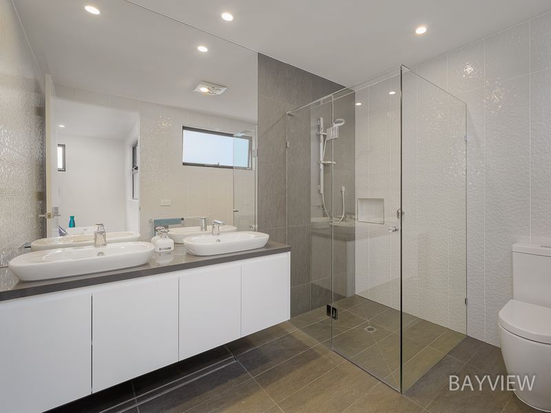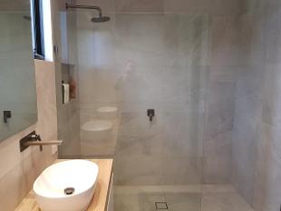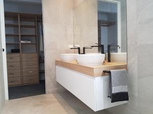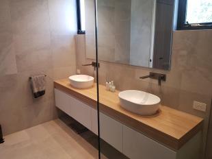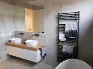 Our bathrooms complement the design brief of the whole home, with floor to ceiling tiles and wall mounted vanities. Great contrast with our gunmetal tap ware and heated towel rails that set off the Oak vanities against the beautiful stone look tiles as seen at Surf st.